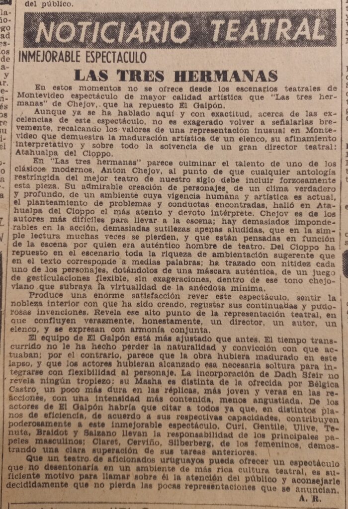 117 Inmejorable espectáculo. Las tres hermanas (de Antón Chejov, por El Galpón). Acción, julio 21, 1957