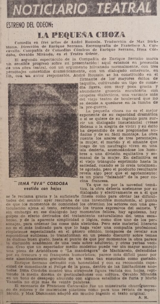 131 Estreno del Odeón, La pequeña choza (de André Roussin, por Compañía Serrano-Córdoba-Miranda). Acción, agosto 19, 1957